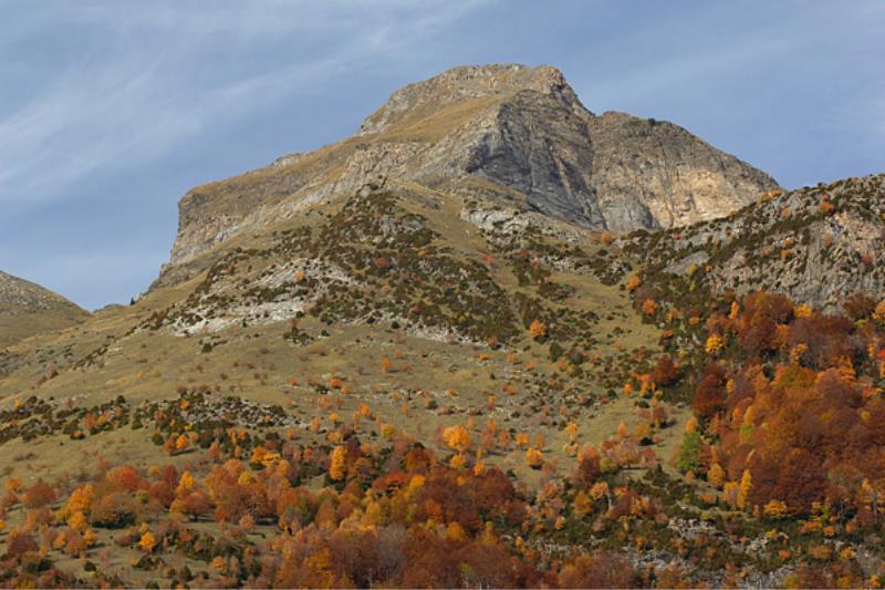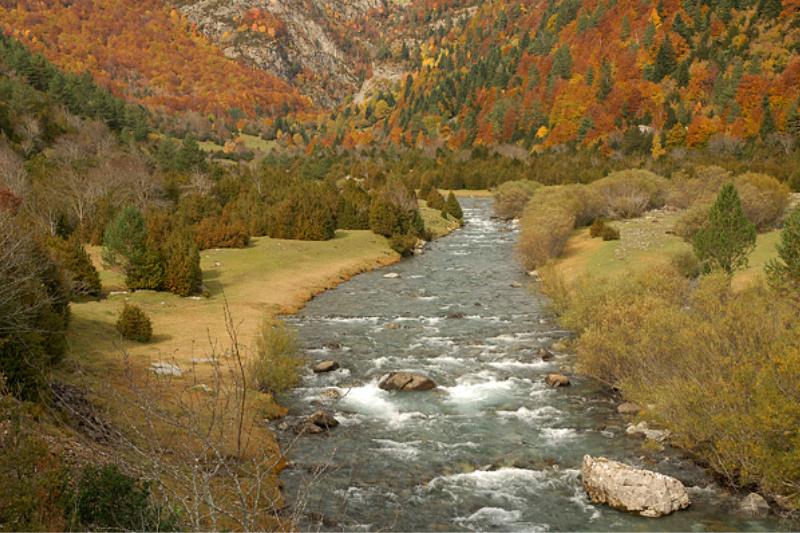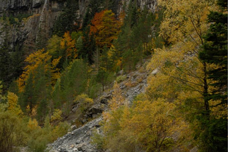 Los bosques del Valle de Bujaruelo son un paisaje único: un manto de tonos marrones y rojos cubre el suelo y las copas de los árboles.